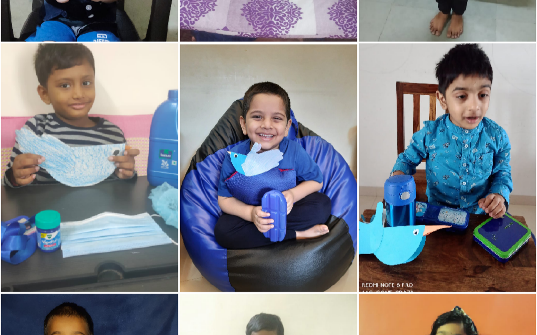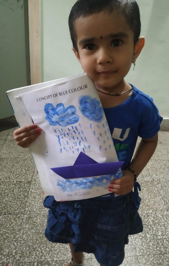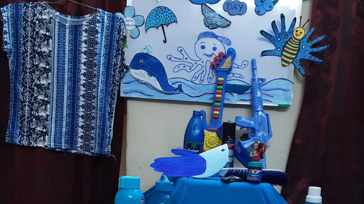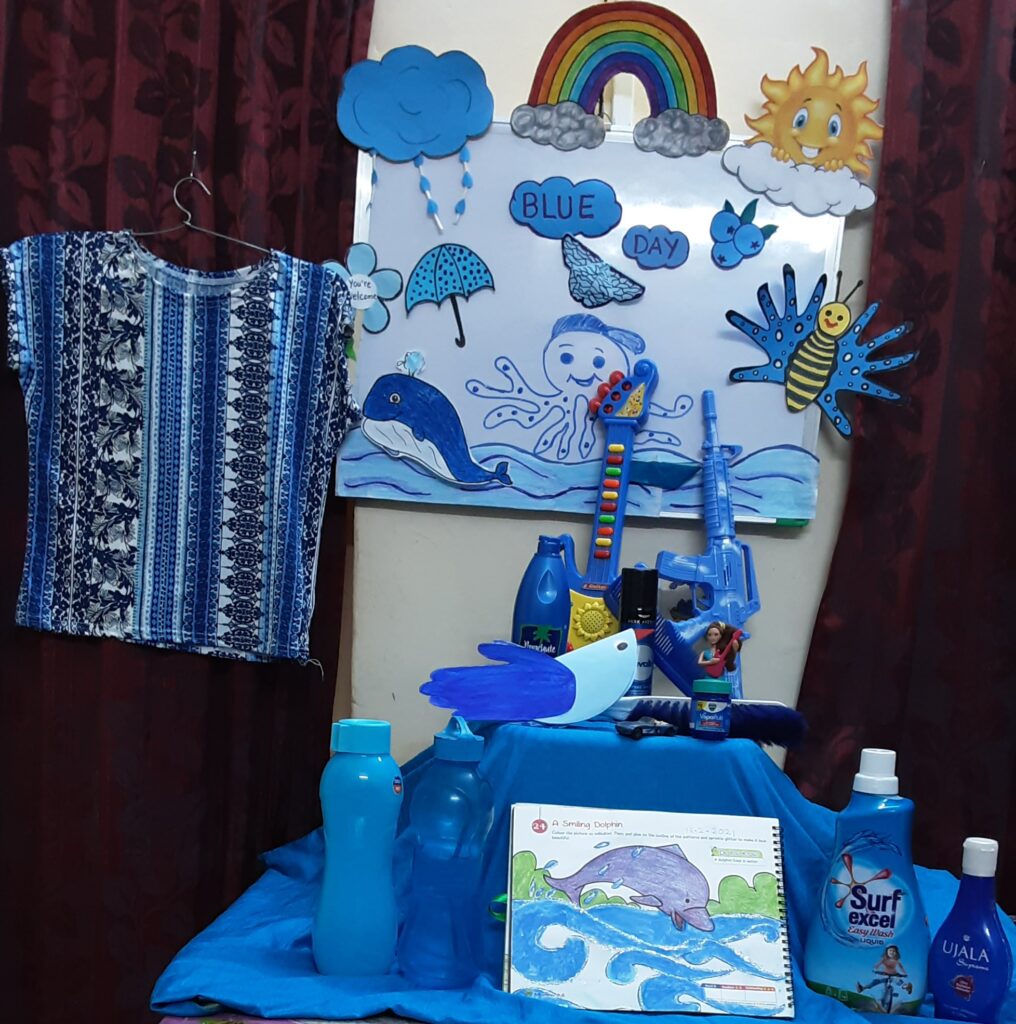 The colour blue is often associated with depth and stability. The students of Naval KG were taught about the colour blue on 19 July 2021. The students and teachers dressed up in different shades of blue and the surrounding area was also decorated with blue coloured things. A short story about various colours and especially the colour blue was shown to the students. Various rhymes related to blue colour was also recited. Many fun-filled activities like origami boat making, making of clouds with cotton dabbing, making fishes using hand and thumbprint, art and craft activities like making of a bluebird, colouring the dolphin etc were organised and carried out. The motive of celebrating the blue colour day was to make the students aware of the colour blue and its significance. Students enjoyed performing various activities through which they learned the concept well.