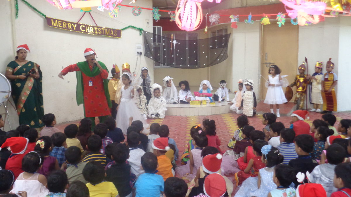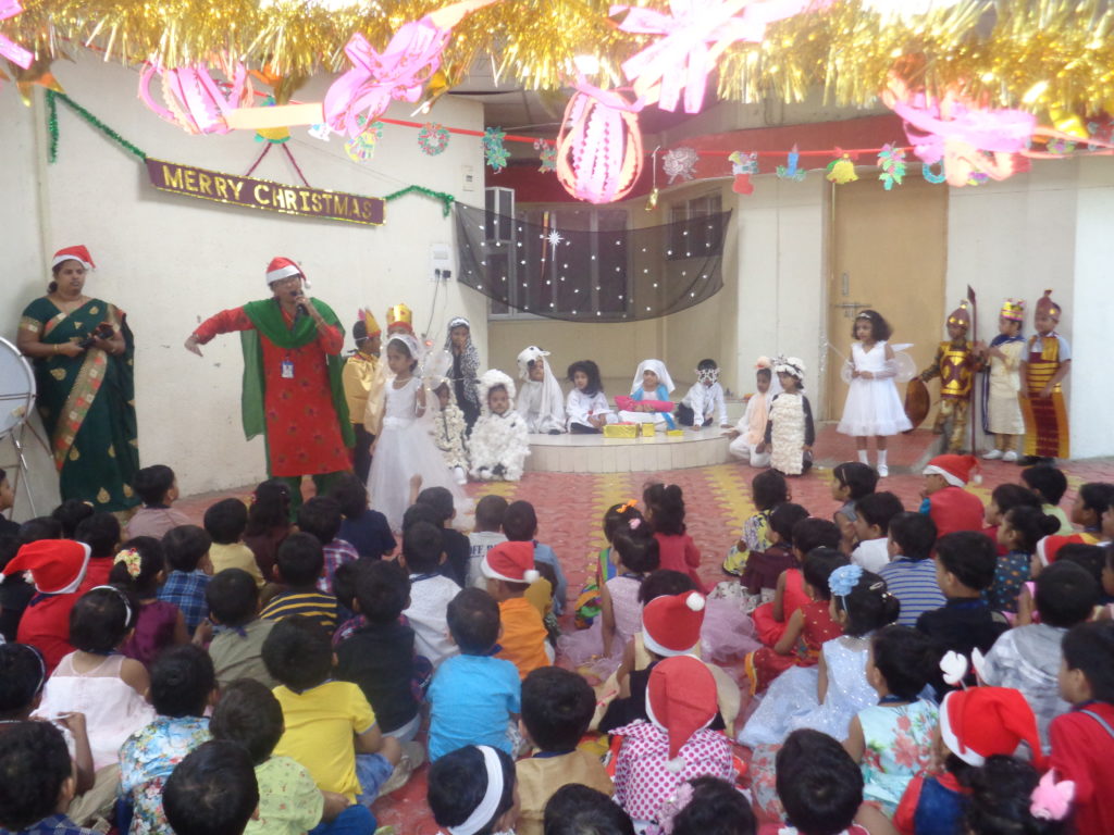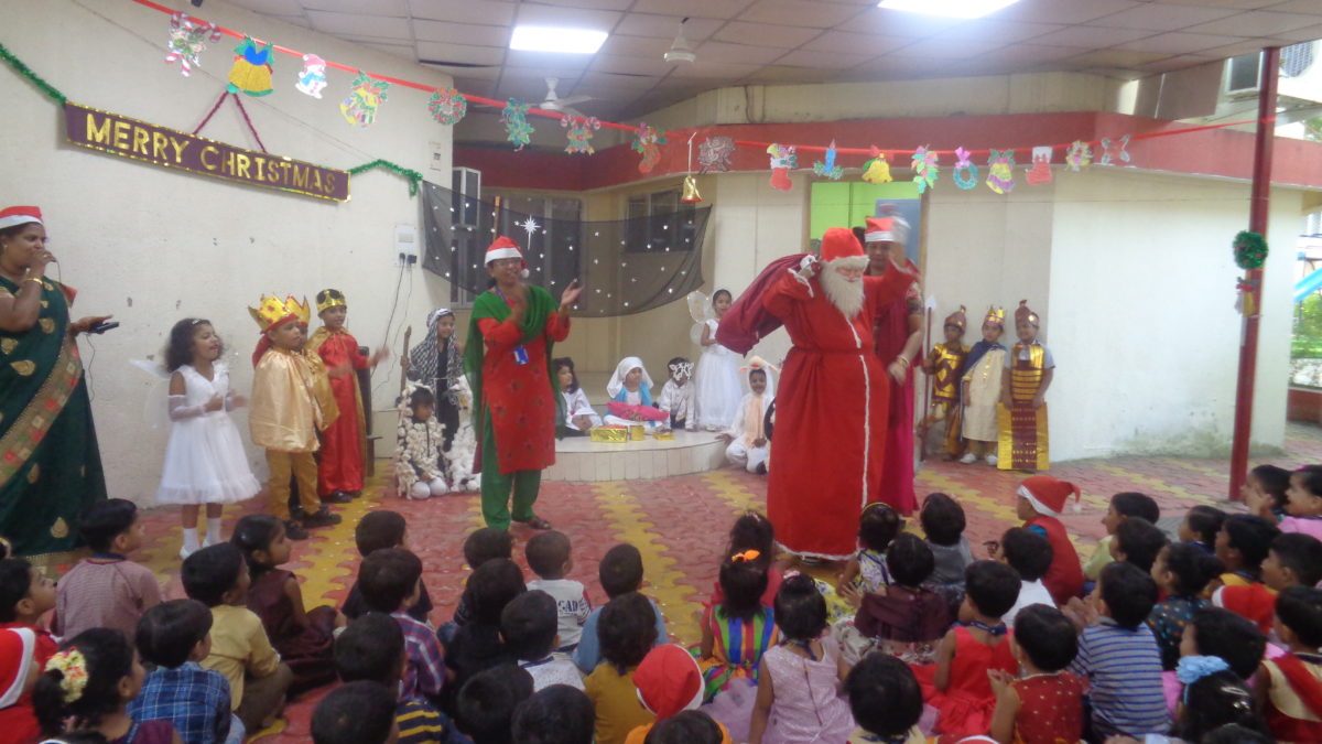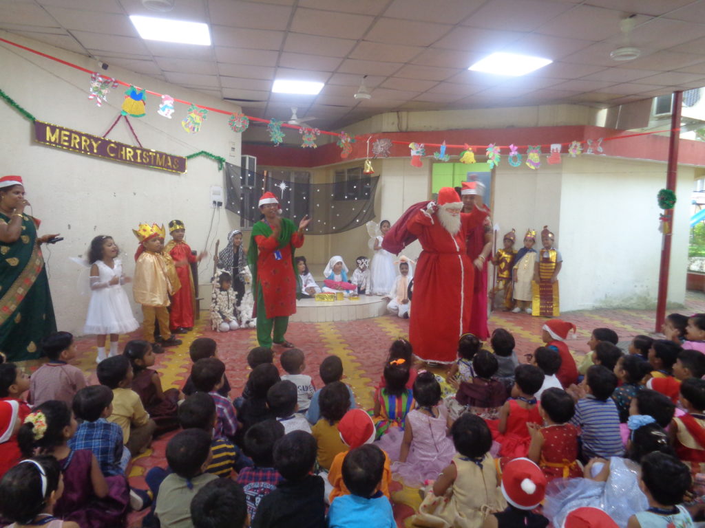 Then the teacher shared a small story about Santa Claus, transformation of a kind hearted boy Nickolas, to Santa Claus. She explained how Santa on his reindeer driven sledge flies high up in the sky and loves to distribute gifts and sweets to everyone around the world on every 25th Dec.