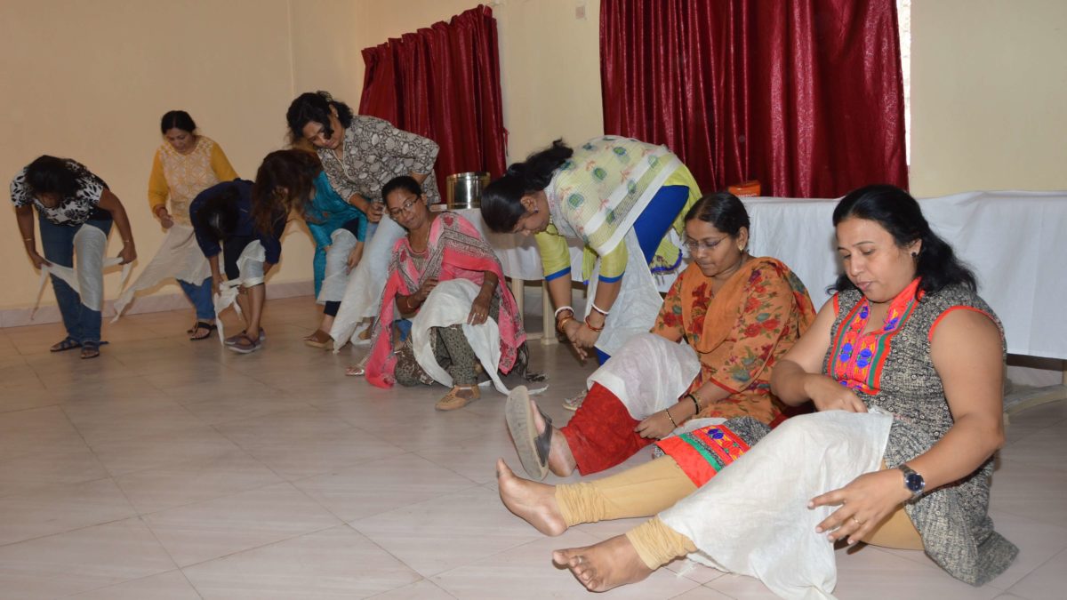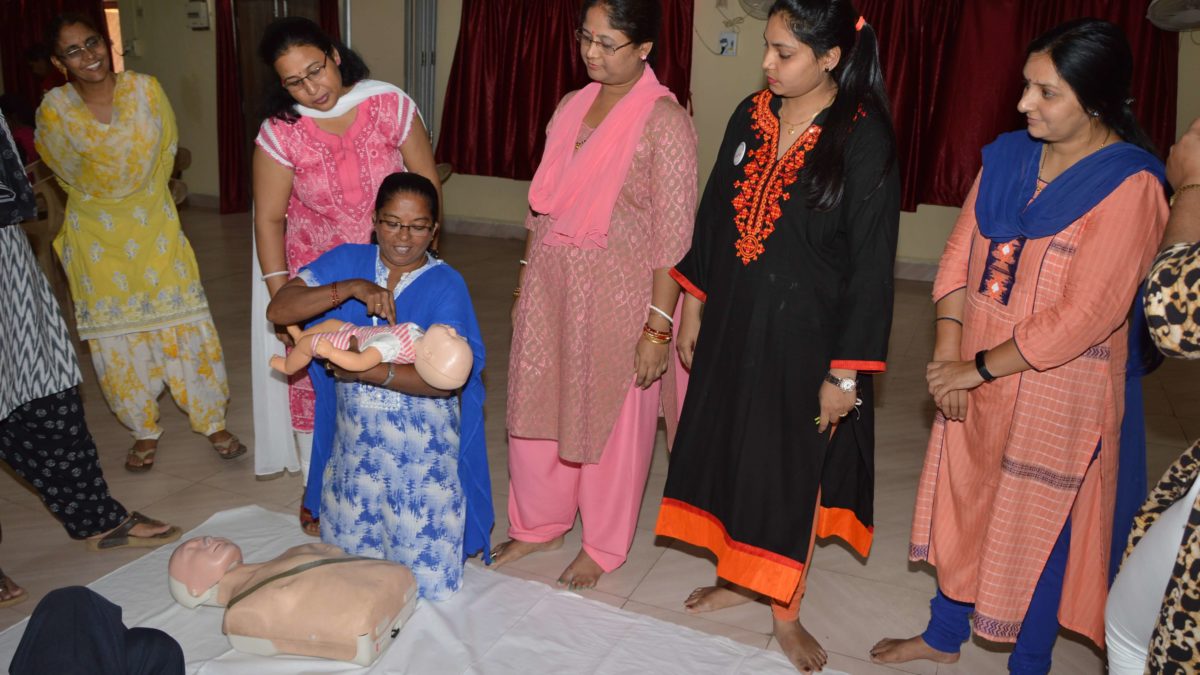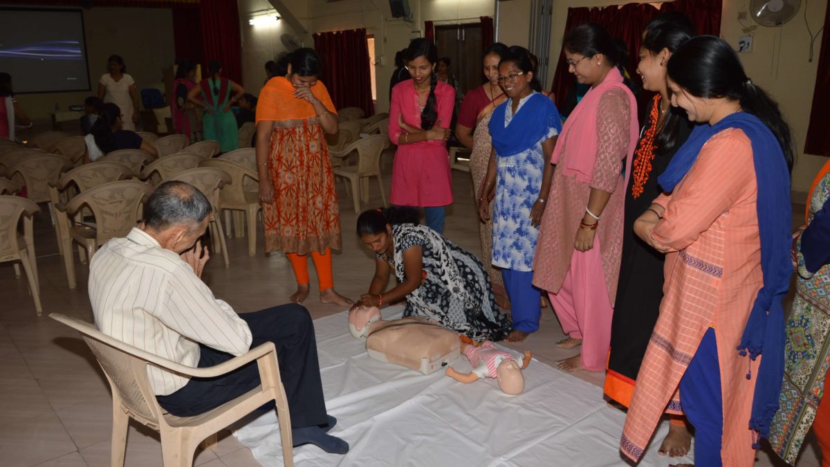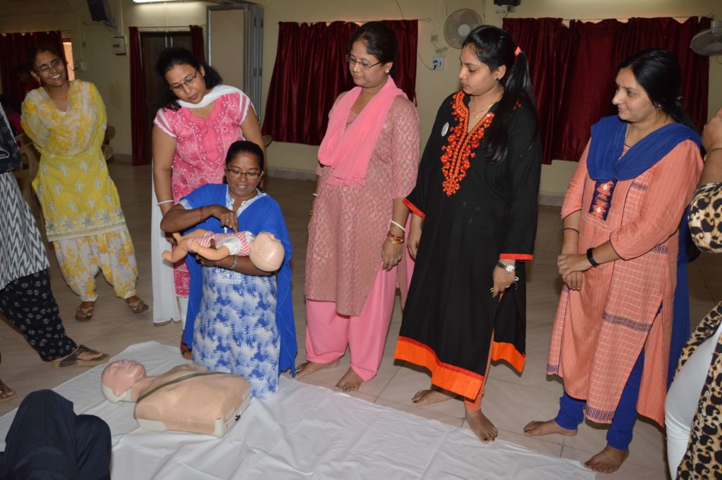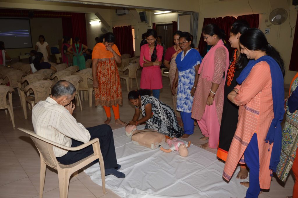 Training began with a session on primary survey of the casualty to establish priorities. Detailed session on Cardiopulmonary resuscitation (CPR) covered who should can be and should be given CPR. Variation in the force applied and number of repetitions were also taught for grownups, pregnant women, children and infant. This was followed by practical session, during which each lady performed the CPR on mannequin of a grownup and dummy infant. Everyone also learned how to use the automated external defibrillator (AED).