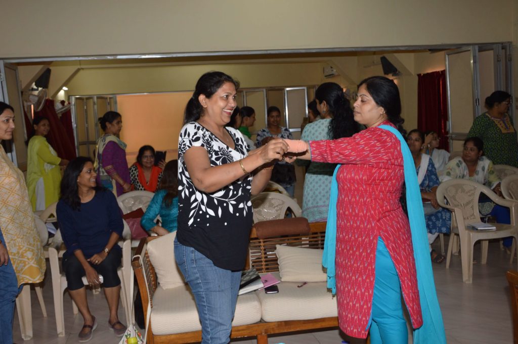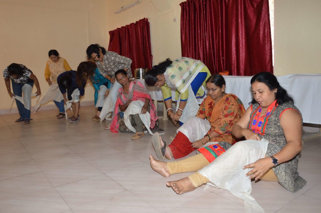 Tying bandage is an art! Post lunch Dr. Mehta taught ladies how to use triangular cloth to tie various bone injuries. Dr. Mehta also taught ladies how to self bandage without doing much damage to the injury. While ladies mastered ‘reef knot’, Dr. Mehta explained the application of different type of slings for various types of injuries. The next session covered comparison between heart attack and stroke. Types of stroke, identifying the difference and taking action was covered.