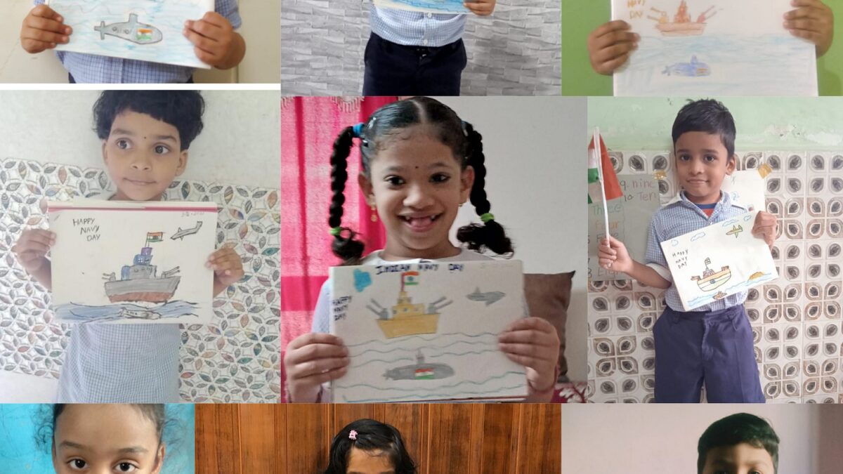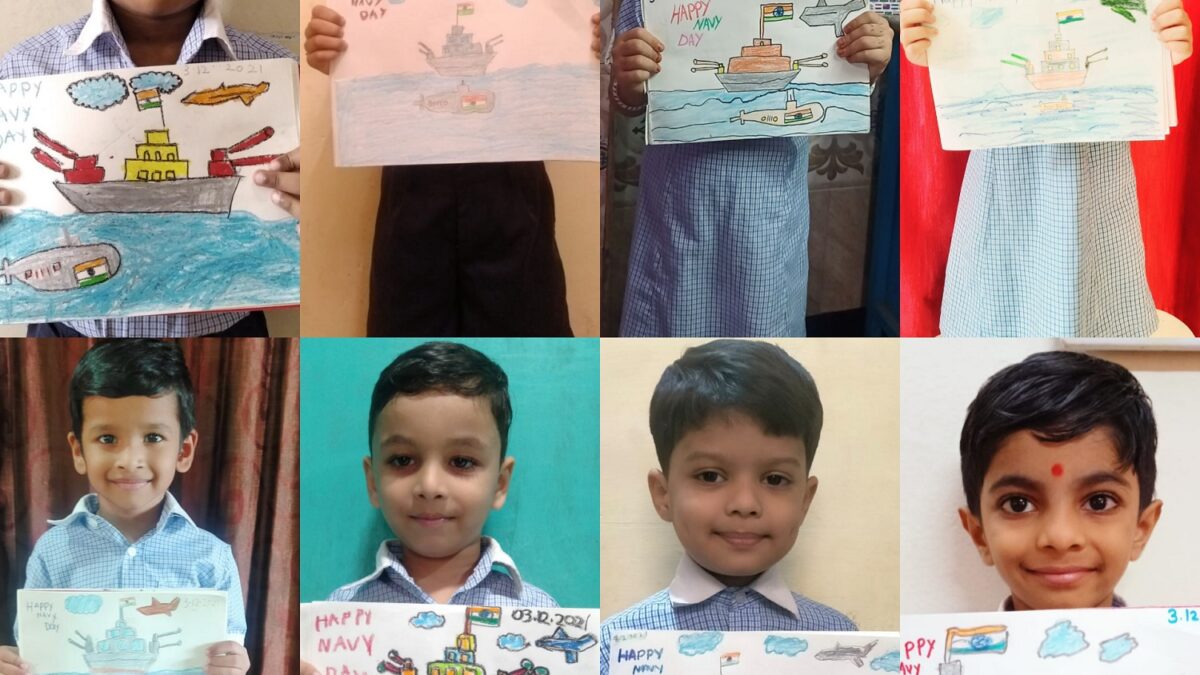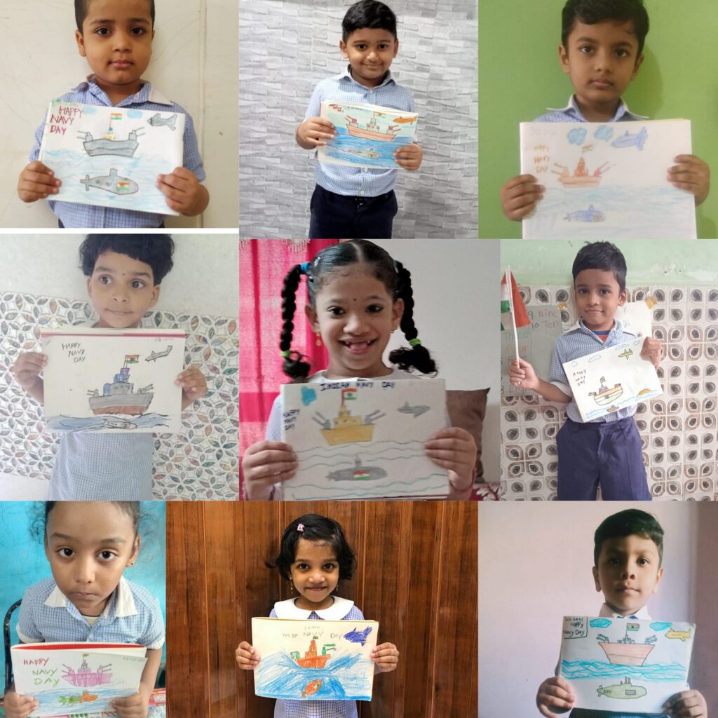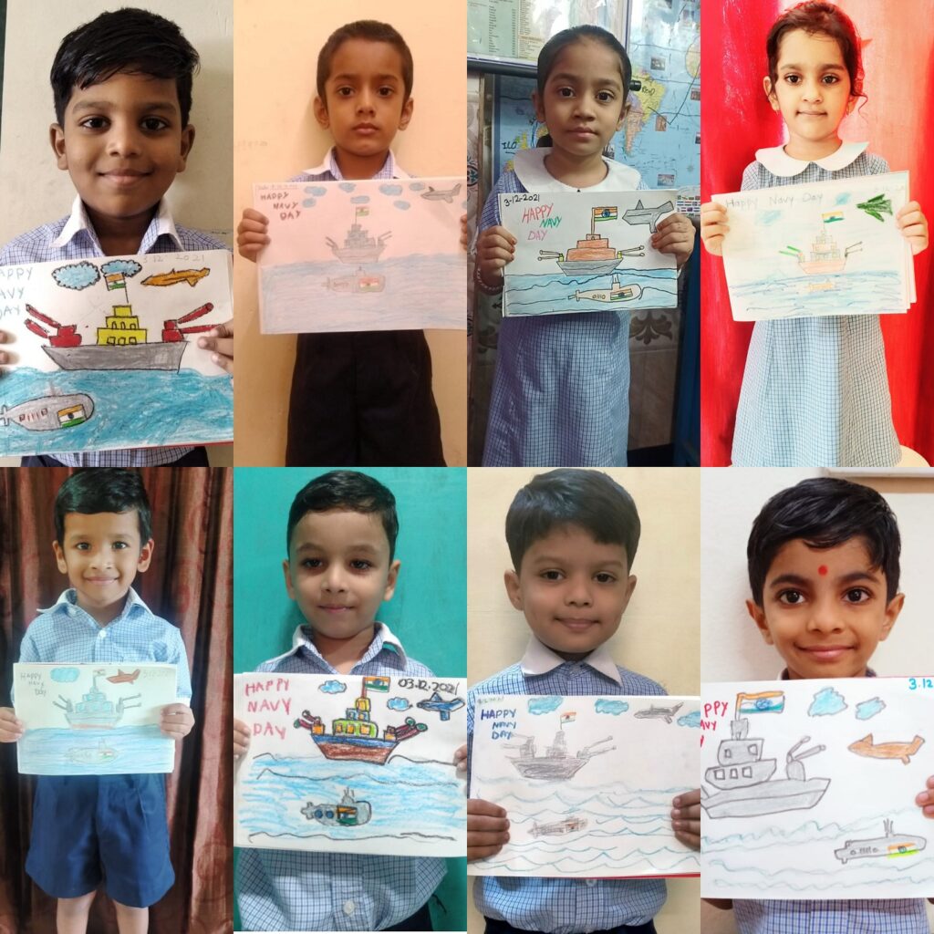 Navy Day in India is celebrated on 04 December every year to recognize the achievements and role of the Indian Navy to the country. On that day in 1971, during the Indo-Pak war, the Indian Navy carried out a daring attack and sank the Pakistani ships off Karachi harbour and also damaged harbour installations. The great warriors of the Indian Navy are also remembered on the Navy Day. Naval KG, Mankhurd celebrated Navy Day virtually. Students were explained the significance of the Indian Navy and Navy Day through short motivational videos and narration by teachers. Students actively participated in the celebrations by drawing pictures of Naval ensign (flag), ships, submarines and aircraft. This was followed by an interactive session wherein students explained what they understood about Navy Day. All these activities also kindled a patriotic spirit in the students.
